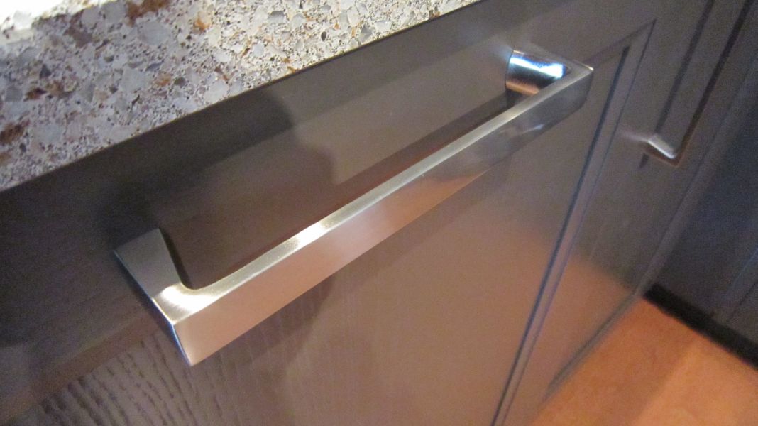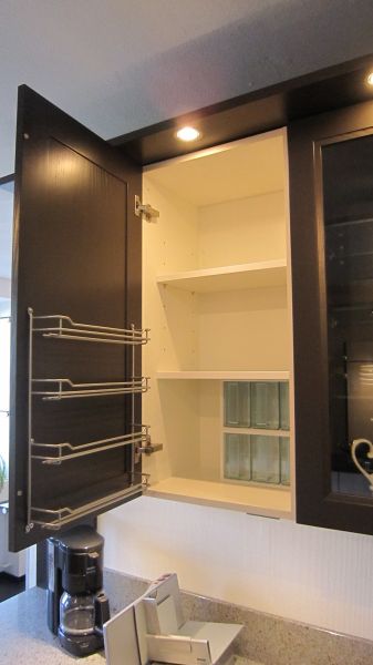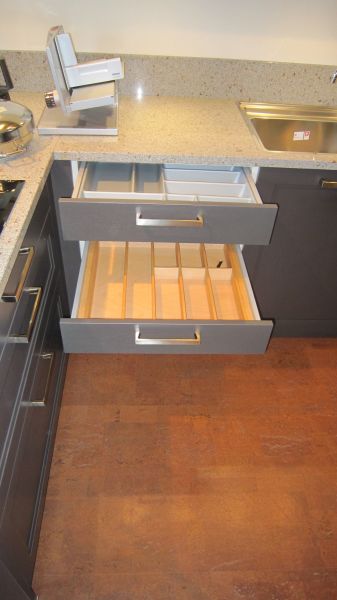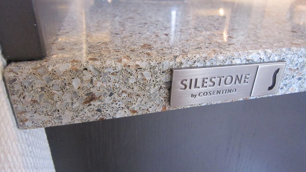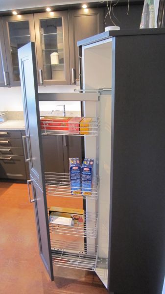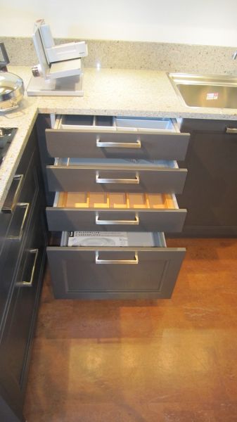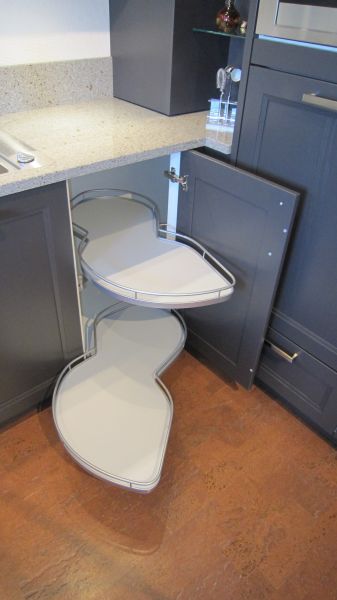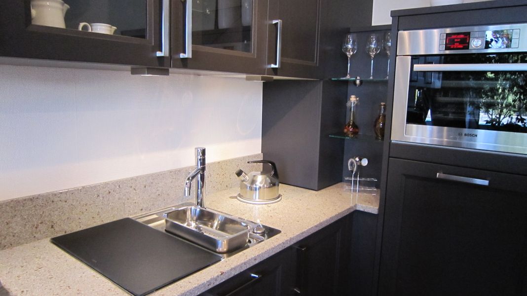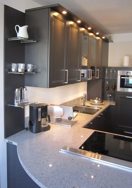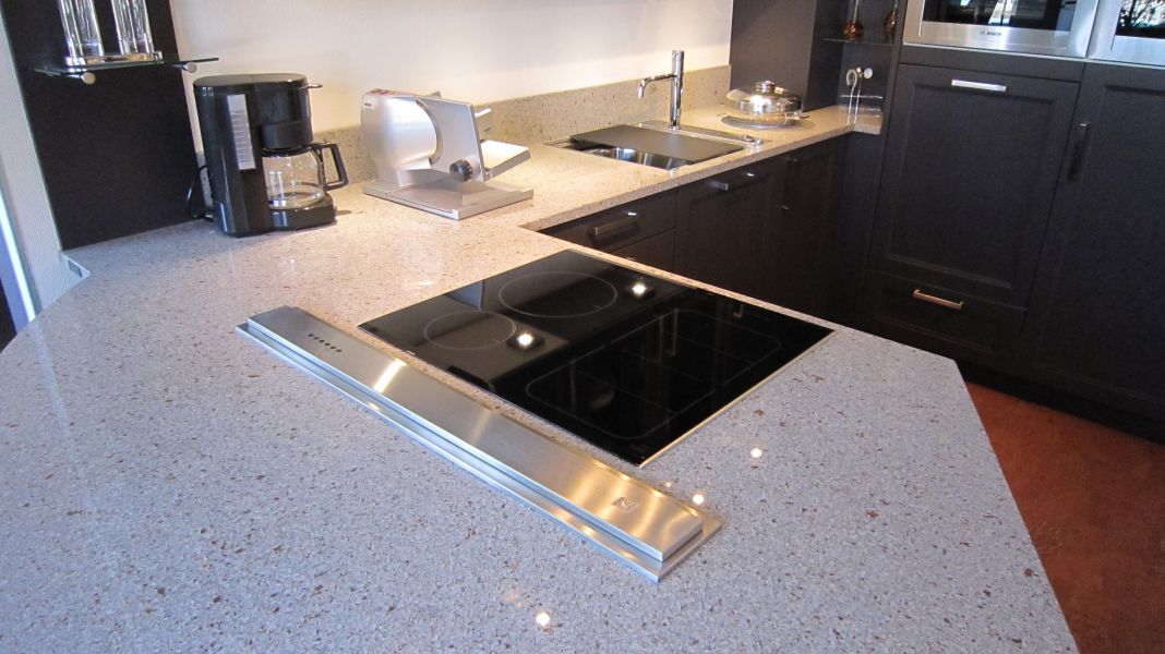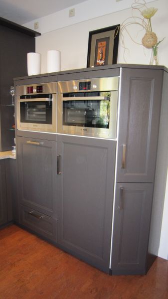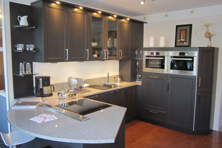 SCHÜLLER-Küche in U-Form Front in modernem Escherahmen terrabraun massiv mit furnierter Füllung; die gebürstete Oberfläche ist mit einem Zweikomponentenlack versiegelt. Geräteumbau für hochgebauten Einbau-Backofen und Dampfgarer sowie Geschirrspüler und Kühlschrank. Arbeitsplatte von Silestone in Quarzstein mit integrierter halbrunder Tischlösung. Alle Auszüge mit Blum-Vollauszugsystem sowie Dämpfung und Selbsteinzug. Eckunterschrank mit LeMans Schwenkauszug. Apotheker-Schrank mit Gitterkörben. Oberschrank mit Leuchtboden sowie Front- und Glastüren.