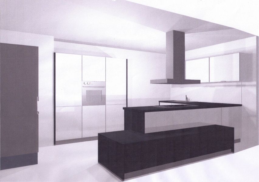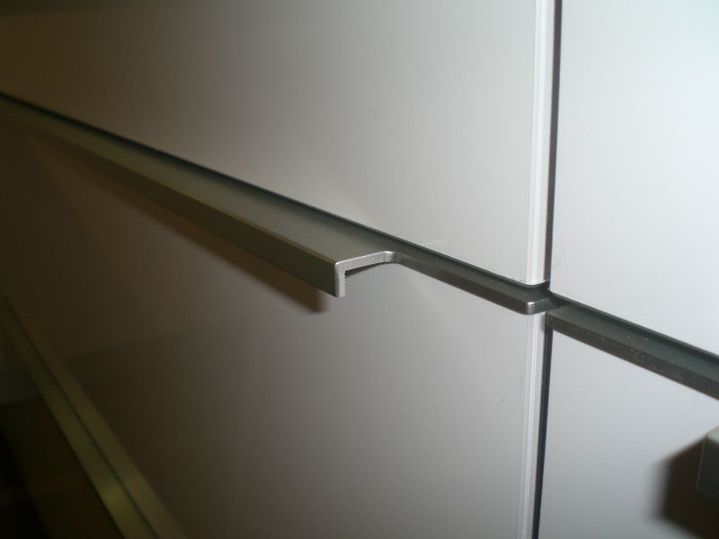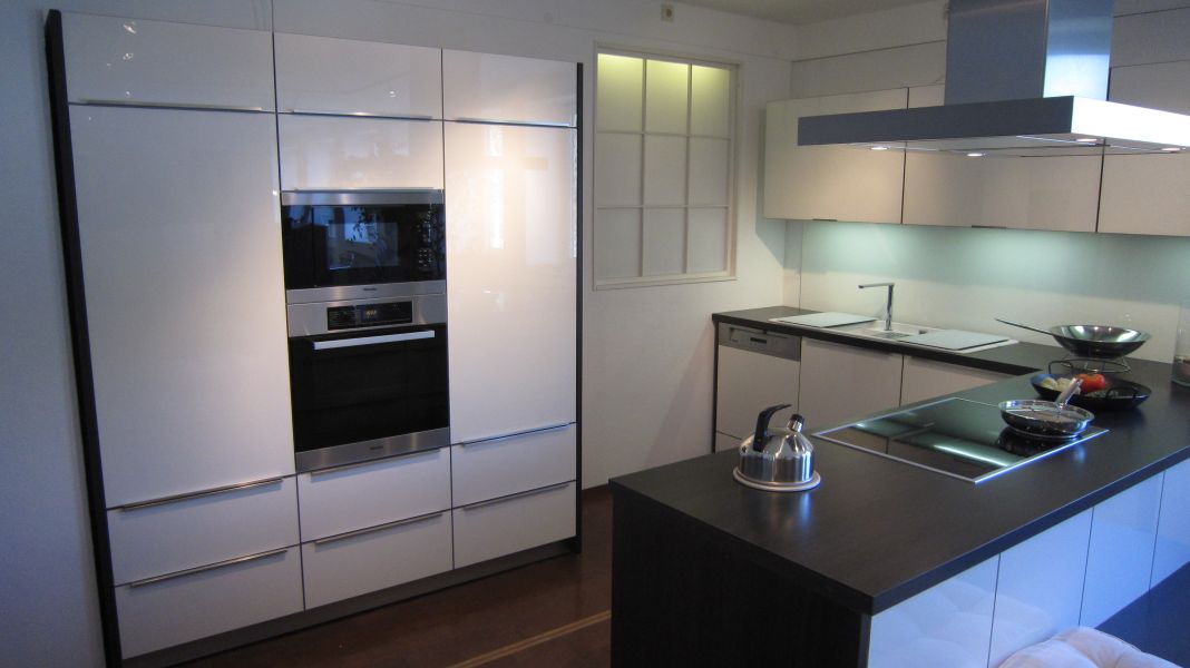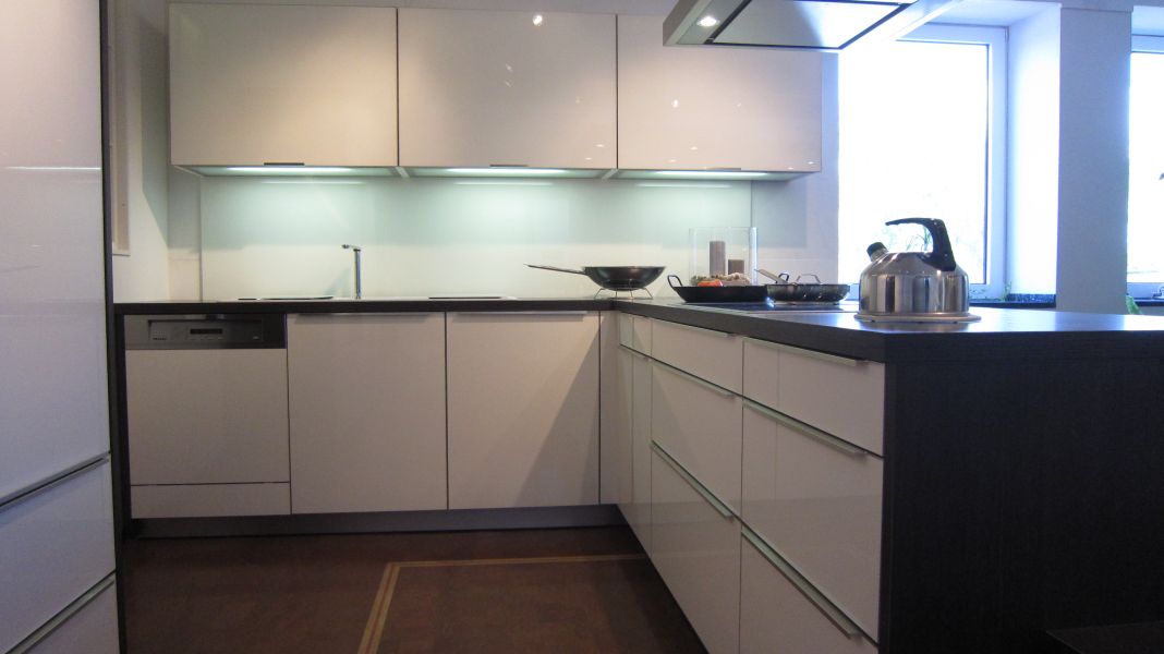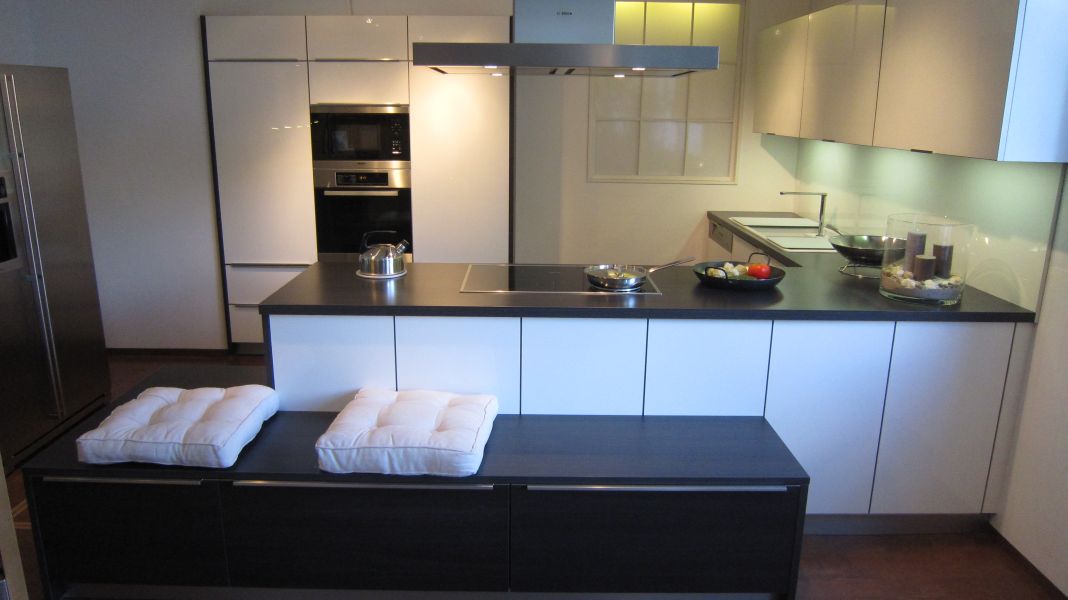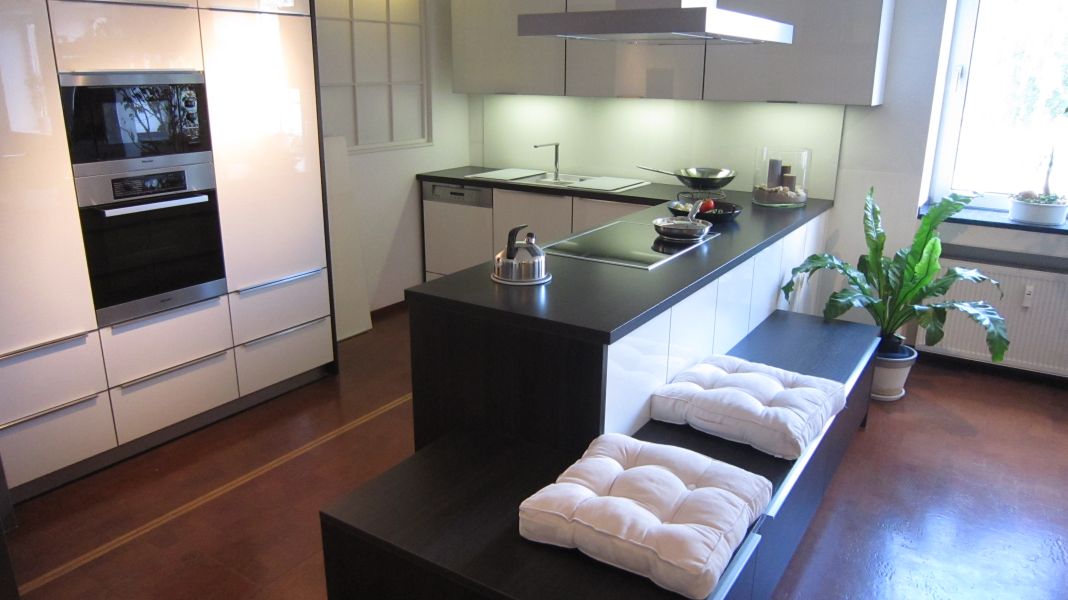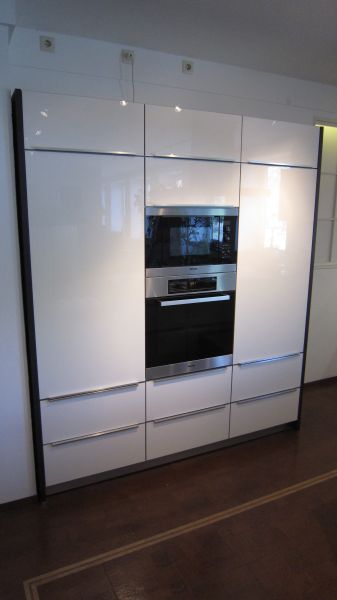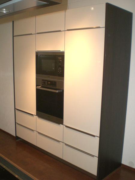 SCHÜLLER-Küche in L-Form mit Geräteumbau für hochgebauten Einbau-Backofen, Mikrowelle und Kühlautomat in Brilliantweiß hochglanz Front mit durchgehender Griffleiste in edelstahlfarbe und Alu-Sockelfüßen sowie eingewangt durch 2,5 cm dicke Wangenelemente in Kastanie basalt NB. Sockelleisten in Frontfarbe