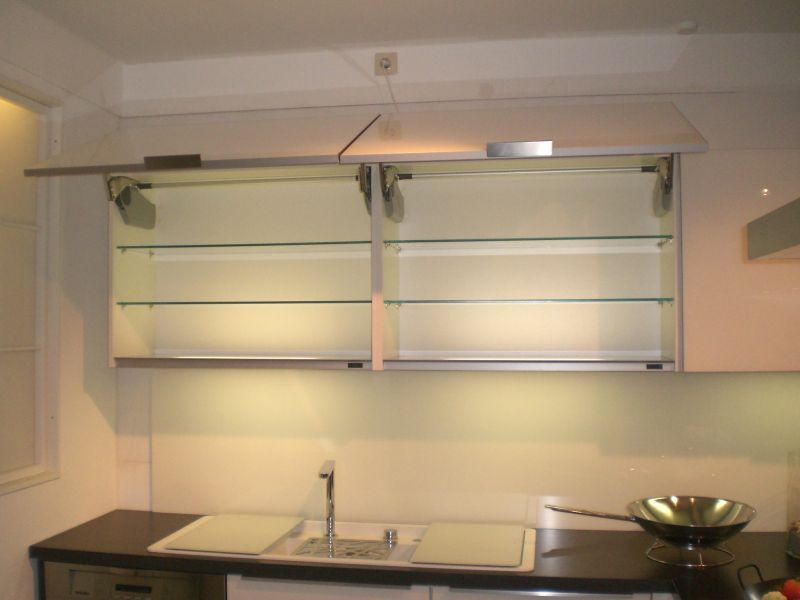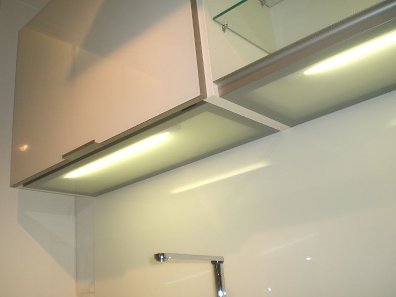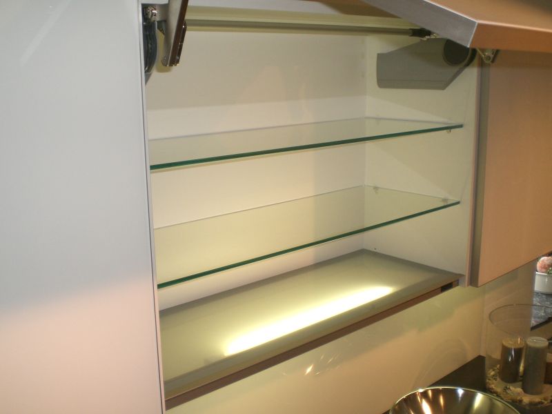 Oberschränke mit Schwenktür in Glas-Desingfront mit Glasinnenböden und Leuchtböden.