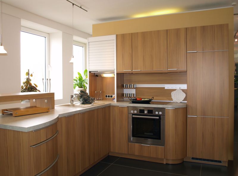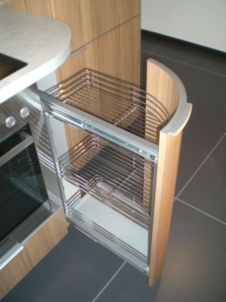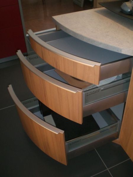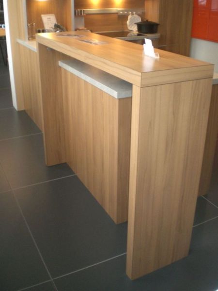 LEICHT-Küche in L-Form, Front in Kunststoff Holznachbildung kernbuche mit Alugriffleisten, Sockelleisten in Frontfarbe, Arbeitsplatte Schichtstoff in valentino hell, Nischenrückwand in Frontfarbe, Etagenaufsatz-Rollladenschrank mit Beleuchtung und Steckdosenleiste, alle Unterschränke mit Auszugstechnik und Dämpfung sowie, Auszugsrundschrank, Auszüge mit Ätztonglas-Seitenteil, Karussellschrank und Theke, Thekenhöhe ca. 115 cm, Arbeitsplattenhöhe 94 cm.